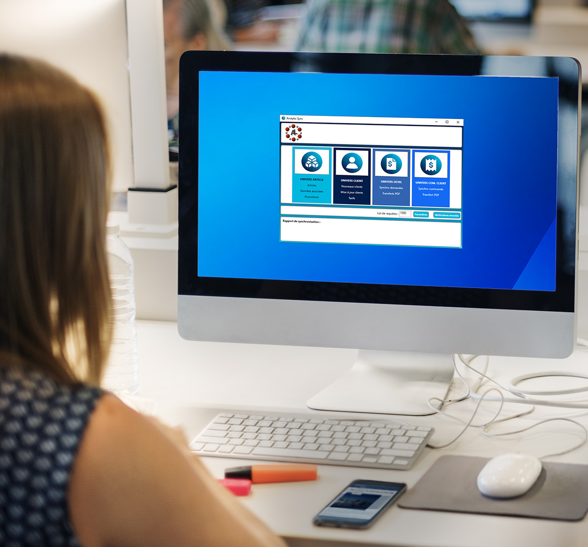 Le logiciel de synchronisation livré a été prévu pour fonctionner de façon autonome ou graphique (avec ou sans interface) et afin de lancer des synchronisations thématiques à intervalles de temps distincts selon la nature des données. Cette synchronisation dispose de fonctionnalités de log locaux (stockés sur le serveur) et de remontés d’alertes techniques ou métier par mail (défaut de stock, erreurs de synchronisation…)