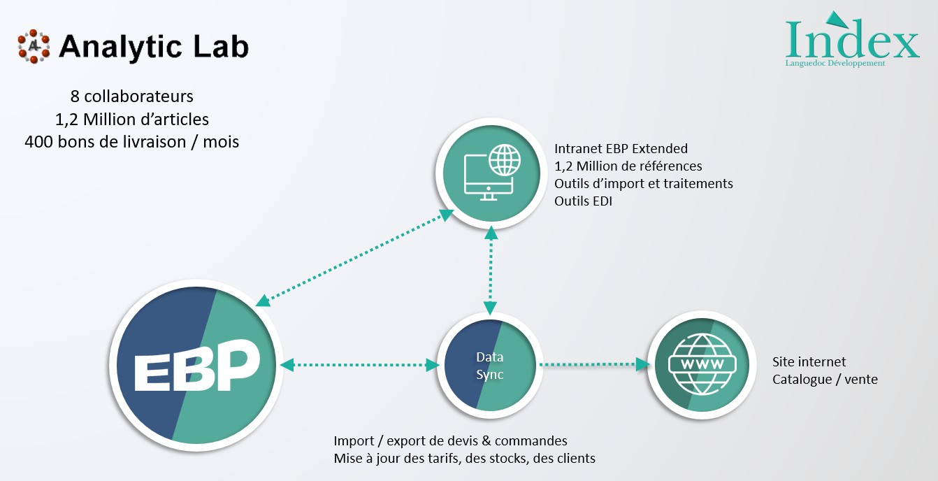 Pour ce projet digital global, nous avons par ailleurs développé un outil de synchronisation pour permettre des flux de données multiples entre la solution de gestion EBP (usage interne) et le site internet utilisé par définition par les clients.